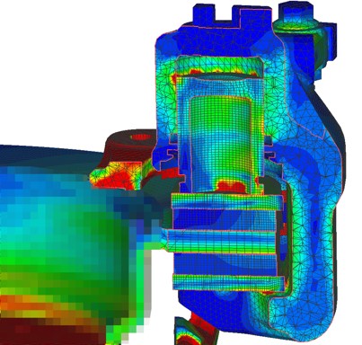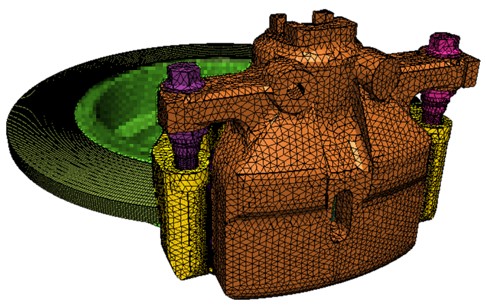 有限要素モデルのメッシュには、主に10節点テトラ2次要素を用い、ピストン・パッド・ディスクなど接触近傍部には、8節点ヘキサ1次要素を用いた。
