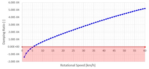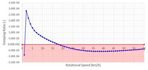 STEP4の複素固有値解析では、STEP3の実固有値解析で抽出した固有モードを用い、動的回転問題に対する計算を行う。ここでは,ディスクローターの回転速度をある範囲で指定し不安定鳴きモードの特性を調べる。具体的な安定性の判定は、式-1で示した相当減衰率の分布を用い、相当減衰率が判定基準値を下回れば、ブレーキに不安定鳴きモードが現れると仮定した。また、回転効果の影響を詳細に確認するために、相当減衰率と回転速度の関係を表すキャンベル線図を出力した。その他、相当減衰率の分布結果から、計算条件の範囲内で、最も不安定なモードにおける、動的挙動を確認するため、ひずみおよび運動エネルギーの密度分布を出力した。
