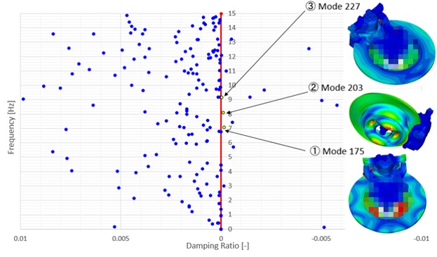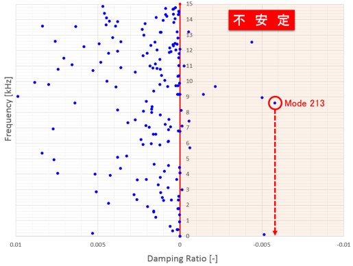 上記のような、低速時に不安定鳴きモード、高速時に安定モードを示すケースは、図-6の①~③の分布位置からも分かるように、相当減衰率がゼロより僅かに大きく、7,000 Hz 以上の周波数という条件下で起こる傾向にあることが分かる。なお、図-7 ①のように、相当減衰率が回転速度の単調な増加関数として表される場合もあれば、図-7 ②、③のように、回転速度の低いゾーンで、変化率が複雑に変化しピークが現れる可能性もあることが分かる。