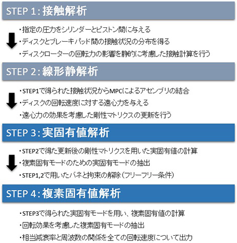 ブレーキ制動時に発生する異音、いわゆるブレーキ鳴きがどのような条件で現れるかをシュミレーションで予測するために、本稿では、図-1に示すフローに従い計算を進めた。