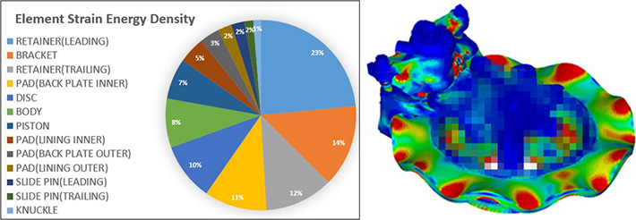 図-8と図-9に示されるブレーキのひずみエネルギー密度分布、および運動エネルギー密度分布図により、視覚的かつ直感的に分布状況を確認した。また、ここでは、各分布に対する寄与率を算出し、円グラフにして結果を示している。図-8から、リテイナー(薄い金属プレート)のひずみエネルギー密度が最大寄与率を示すことから、この不安定鳴きモードにおいて、曲げ変形が大きくなることが予想される。また、図-9の運動エネルギー密度分布の結果から、ブレーキ鳴き現象の象徴的兆候であるディスクとピストンに大きな運動エネルギーが生じていることが確認できる。