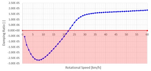 ディスクの回転速度が低いときの相当減衰率の分布状況を確認するため、図-5の回転速度が1km/hのときの相当減衰率の分布を確認した。ここでは、減衰率が負値となる不安定モードが、この回転速度の場合、10個発生していることが分かる。 - (b)相当減衰率と回転速度の関係(キャンベル線図)