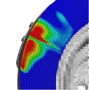 図-3 ディスクに生じる接触圧分布状況(青は最小値:0MPa、赤は最大値:1MPa)