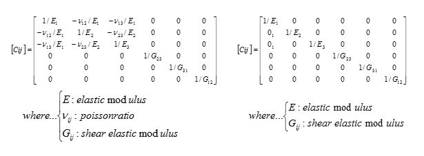 また、ブレーキパッドに代表される摩擦材の動的特性については、異方性を示すことが一般に知られており,式-4に示される面内等方性材料モデルがよく用いられる。ここでは、動的応答試験の測定値と数値シミュレーションの合わせ込みにより、全てのポアソン比をゼロとし、対角項のみに値が入る、式-5の材料構成則を用いて検討を進めることとした。