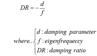 ブレーキの複素固有値解析を行えば,計算結果として相当減衰比率が得られる.ブレーキの不安定鳴きモードの指標である相当減衰比率:DRは、式-1より求められる値であり,正値のとき安定モード,負値のとき不安定モードと判定される。
