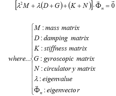 ブレーキのシステム全体にかかわる動的特性を厳密に評価するために,式-2に示す回転効果を考慮したマトリクス運動方程式を用い、複素固有値解析を実施した。