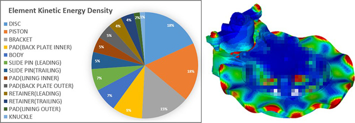 ここでは、図-5に示した相当減衰率分布を用い、最も強く不安定鳴きモードが現れた、Mode 213(周波数8,609 Hz)を対象にして、運動エネルギー密度分布、ならびにひずみエネルギー密度分布について確認を行い、それらに関する各ブレーキパーツの寄与率について調べた。