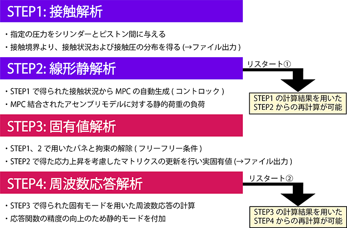 図-1に、ブレーキのアセンブリモデルを用いた接触-振動連携解析の計算プロセスを示す。4つの計算ステップは、1つのジョブ内で、接触解析、線形静解析、固有値解析、周波数応答解析の順に連続的に実行することが可能である。