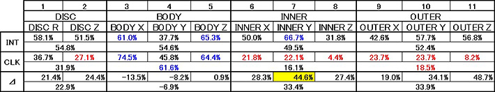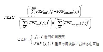 STEP4の周波数応答解析結果の計算精度については、式-2に示すFRAC(Frequency Response Assurance Criteria)値により検討を進めた。FRACアセンブリモデルの11箇所について、加振点および加速度を計測する応答点を設定し、応答特性の比較は、応答点におけるイナータンスを用いて行った。表-1に各計測点におけるFRAC値の傾向を示す。