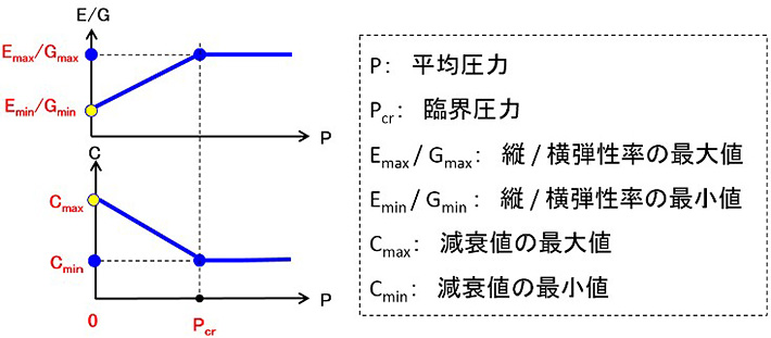 界面要素に用いる動的特性は、要素の縦/横剛性、および減衰率がいずれも平均圧力の関数で表現されると仮定し、接触面の構成節点が全て非接触であれば、界面要素間にMPCは生成されず、剛性および減衰係数は、母材の静的特性に完全に一致すると仮定した。