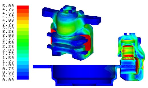 まず、2.2の静的解析の計算結果により、圧力荷重を1.0MPaに設定した接触解析の結果は、図-6の相当応力の分布状況より、ピストンからキャリパに至る一連のパーツに伝達し、接触力が正しく伝わっていることが、モデルの断面図などから視覚的に確認できる。