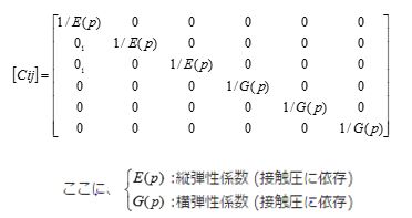接触解析では、一般的な等方性弾性材料、一方、動的解析では、直交異方性弾性材料を用い、接触解析で得られた要素の平均接触圧に依存した動的な材料特性を用いた。